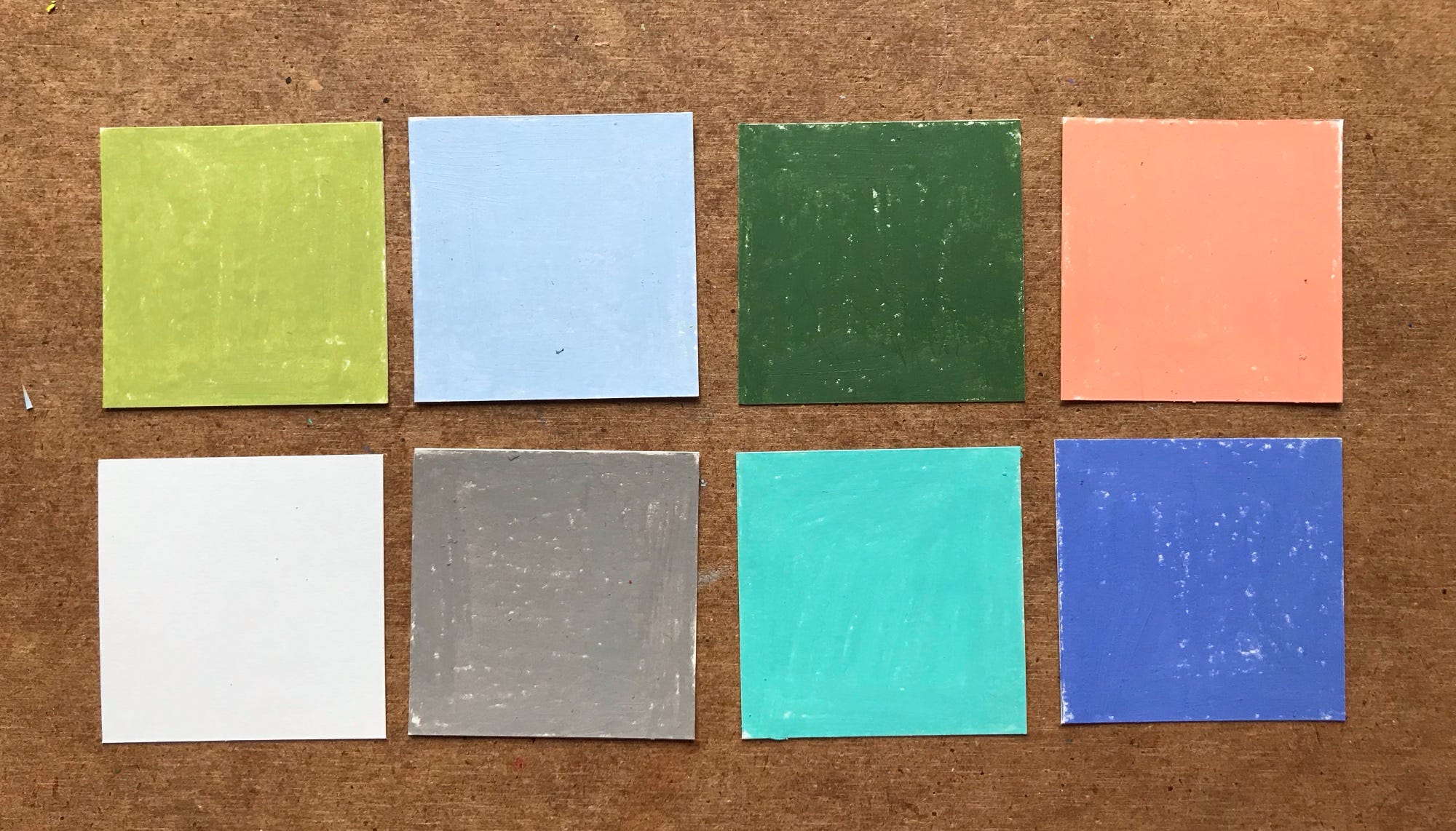 The images will stick better together if there is a cohesive look in a limited colour palette. Prepare squares (6cm x 6cm) and colour them with the colours you can imagine as a background. Choose neutral tones. Red and yellow are greate accent colours, but too bright for a background. I am using hot pressed paper 190g (90lbs).
