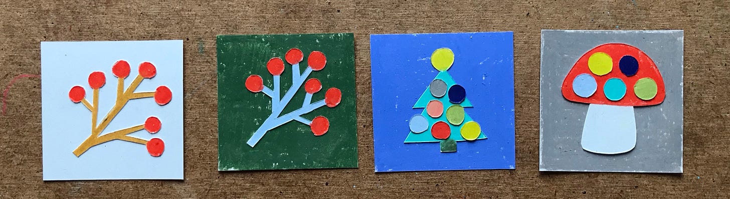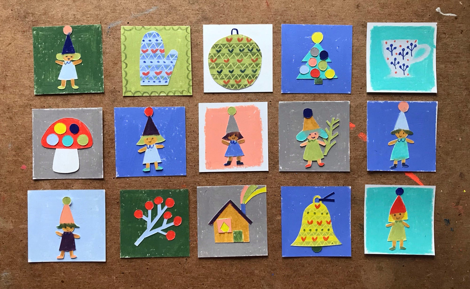 Choose your design for the back of the cards. I like the Christmas tree a lot, but the one card with white background is very calm and might be a better fit for the back design. Take photos scan, print, glue. Do whatever it takes to bring this set together.