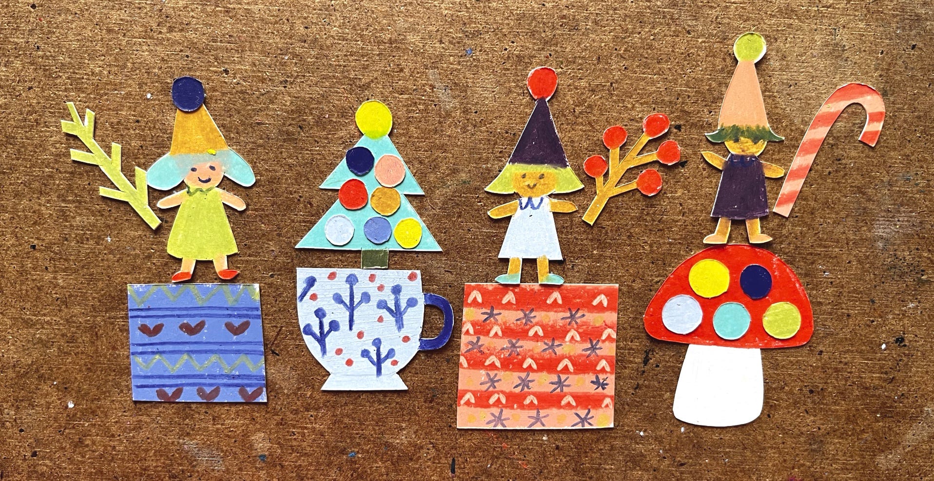 You need about 12 pairs, but don’t count at the beginning, create as many as possible, think around the corner, but stick to your theme. It would be nice to give the fairies names and own stories. The sweet fairy could hold a candy cane. The music fairy could be playing a trumpet.